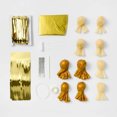 Decorate like a pro with the 52ct Large Balloons Arch with Backdrop Gold/Black From Spritz™. Following the latest party trend, this set includes illustrated instructions to build out a feature backdrop with a metallic fringe curtain and balloon arch. The white and gold colors are great for everything from birthdays to weddings, and will offer picture perfect style for your next big event. The Balloons Arch with Backdrop from Spritz can be attached to party banner, walls, doorways, banisters and more to bring an extra twinkle to the party.