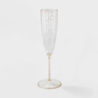- Disposable plastic champagne flute glasses with gold glitter that are perfect for large parties