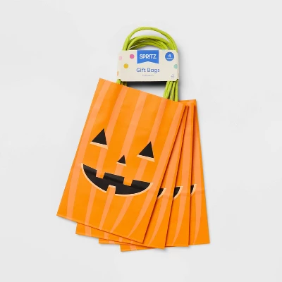 Add a touch of Halloween fun to your gift-giving with the 4pk Tote Bag Jack O’ Lantern – Spritz™. These multicolored paper bags feature a charming pumpkin pattern, perfect for the spooky season. Measuring 8.375 inches in height, 5.25 inches in width, and 3.25 inches in depth, they’re just the right size for small treats or party favors. Ideal for adding a festive flair to any Halloween celebration!