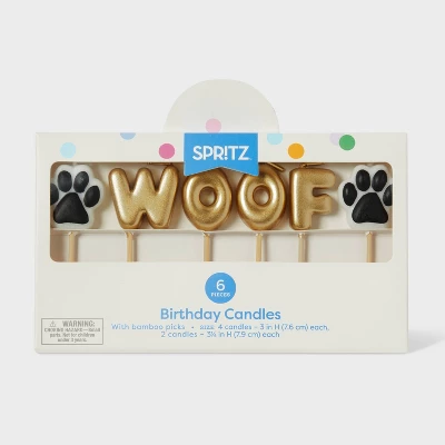 Make your pup’s celebration extra special with the Dog Pet Party “Woof” Candle from Spritz™. This adorable pack includes two paw-shaped candles and four letter candles spelling “WOOF,” adding a playful touch to any dog-friendly party. Each candle stands at 3 inches tall and is made of quality wax, making it the perfect way to top off a treat for your furry friend’s big day.