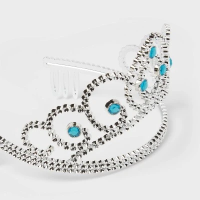 - Plastic tiara designed with sparkly silver bead detailing and blue faux gemstones
