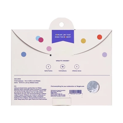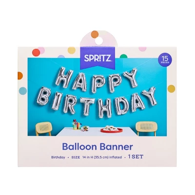 Take birthday celebrations to the next level with this ‘Happy Birthday’ Foil Balloon Set from Spritz™. This foil balloon set includes 13 silver balloons that spell out ‘Happy Birthday,’ providing a fun party backdrop for your next birthday party. The set comes with an included string and inflating straw for easy use, and it pairs easily with the rest of your party decorations. Simply pair with coordinating latex balloons and add complementary streamers for the complete celebratory vibe.
