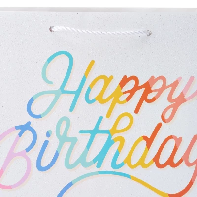 Present your gifts to a special person in adorable style with this “Happy Birthday” Small Gift Bag from Spritz™. Featuring “Happy Birthday” in bright, rainbow colors on a white backdrop for a fun and festive look, this paper gift bag is the perfect size for any small gift, and is great for birthday presents. Plus, the soft fabric handles make for easy carrying. Just pop the gift in and dress it up in a nest of matching tissue paper, and get ready to gift.