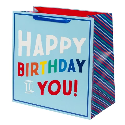 Add more cheer to your birthday gift without much hassle with the Square Birthday Gift Bag from Spritz™. Featuring “Happy Birthday to You” written on a blue backdrop with stripe detailing on the sides for charming flair, this paper gift bag is the perfect size for any medium to large gift, and is great for birthday presents. Plus, the soft fabric handles make for easy carrying. Just pop the gift in and dress it up in a nest of matching tissue paper, and get ready to gift.